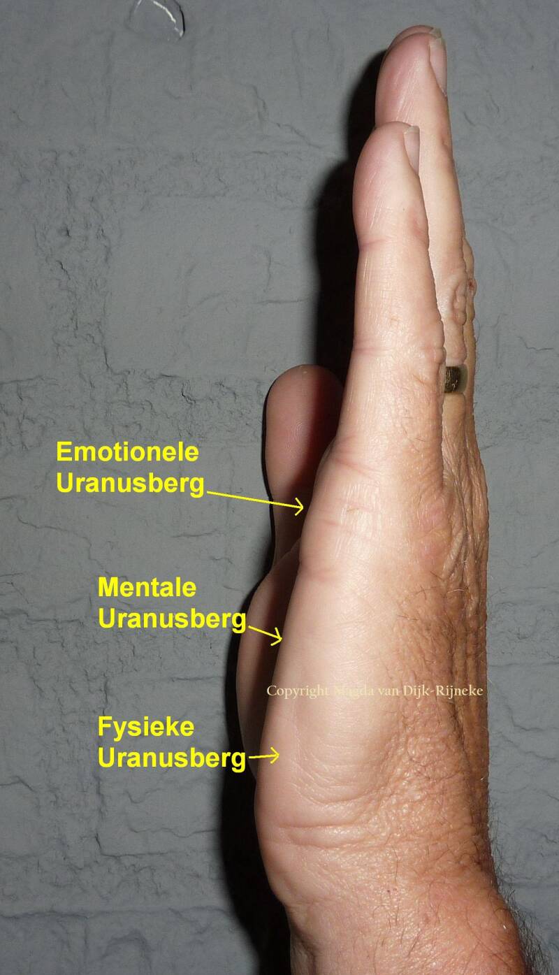 [De Uranusbergen, aangeduid als de Fysieke Uranusberg, de Mentale Uranusberg en de Emotionele Uranusberg, liggen op de percussie (slagzijde) of zijkant van de handpalm, naast de palmbergen.]